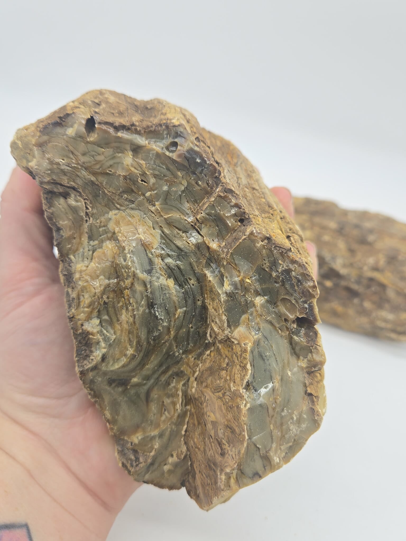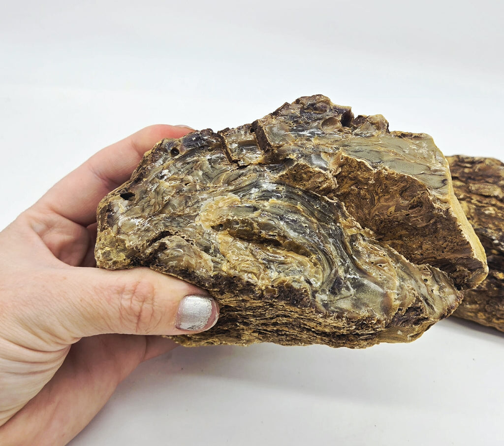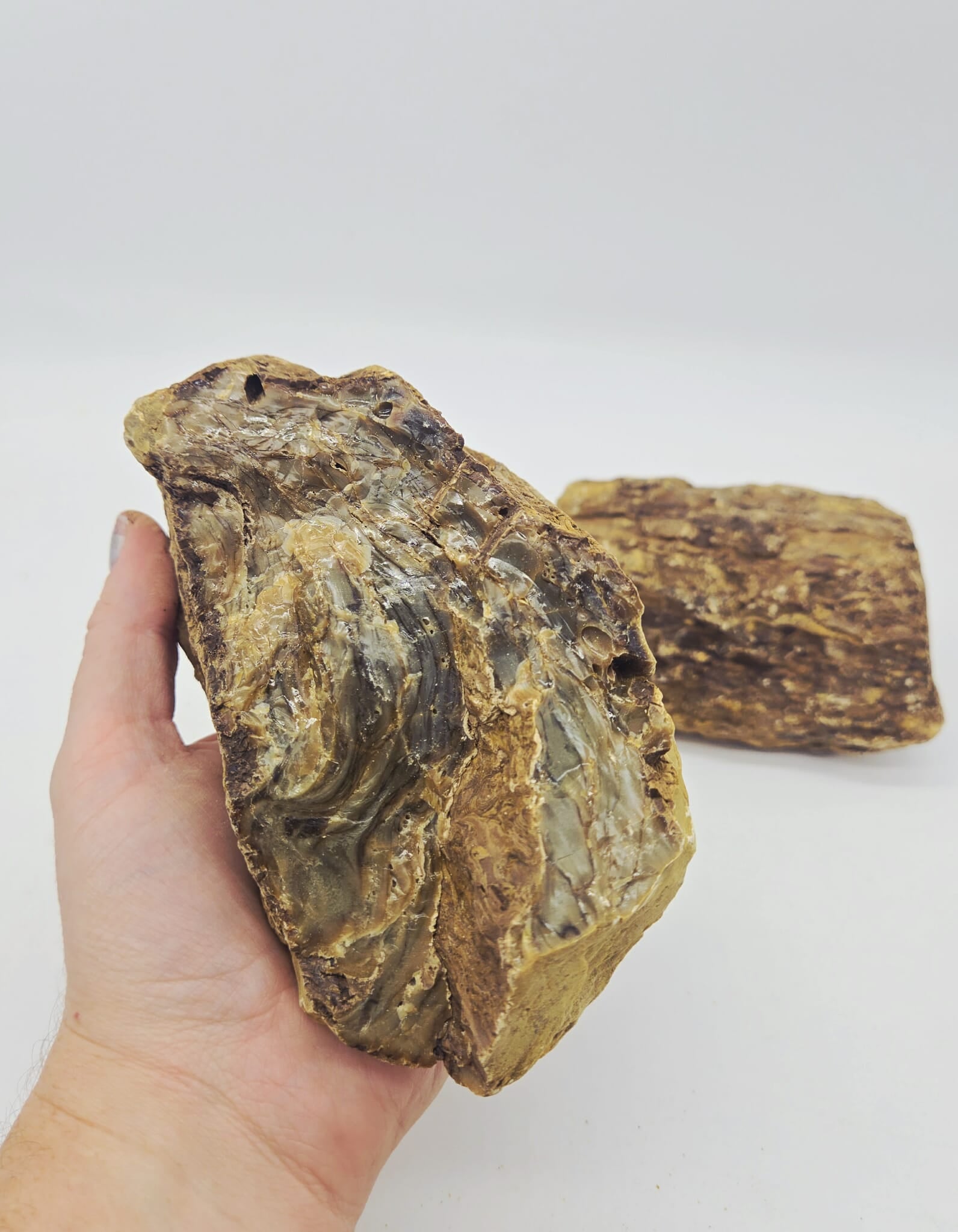 Amber isn't a stone or crystal at all, but fossilized tree sap/resin that has been appreciated for its color and natural beauty since Neolithic times. Much valued from antiquity to the present as a gemstone, amber is made into a variety of decorative objects and is used in jewelry. It has also been used as a healing agent in folk medicine. Amber is considered the "soul of the tiger" in Asian cultures and regarded as the stone of courage and because of this, pieces of amber were carried for protection during long travels, as well as used to treat jaundice. It is also believed that amber balances emotions, attracts good luck, inner child release, creativity/focusing, solar plexus and sacral chakras, psychic shielding, inner peace/calming, learning patience, and lots more. These are all raw and untreated or polished in any way. They are palm sized or bigger and as you will feel, they are super light weight.