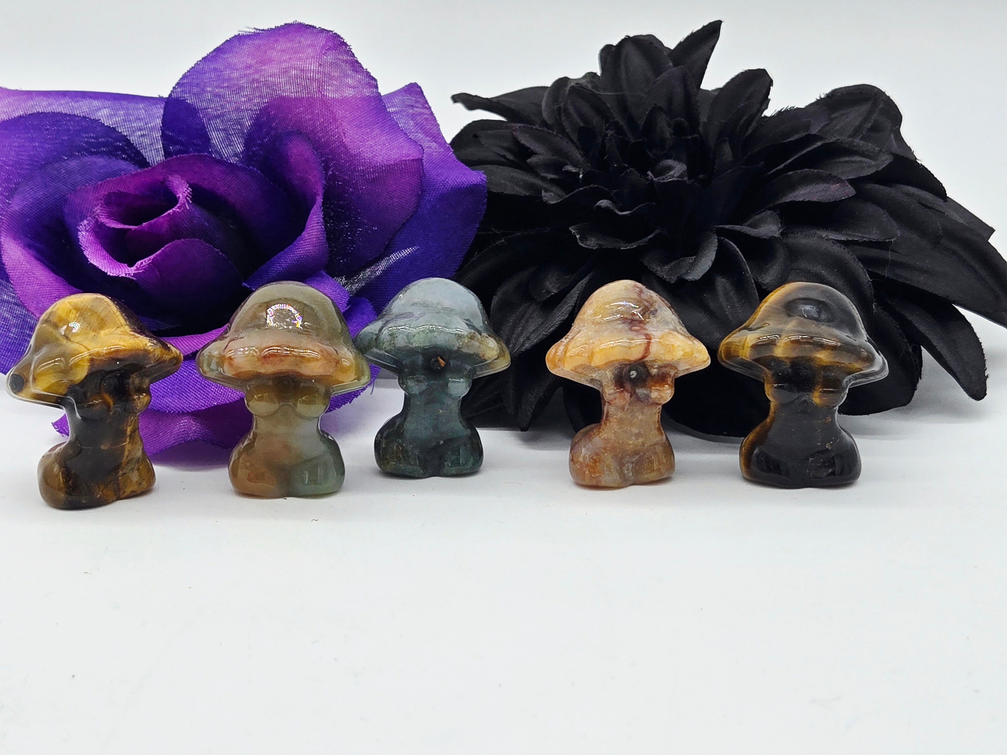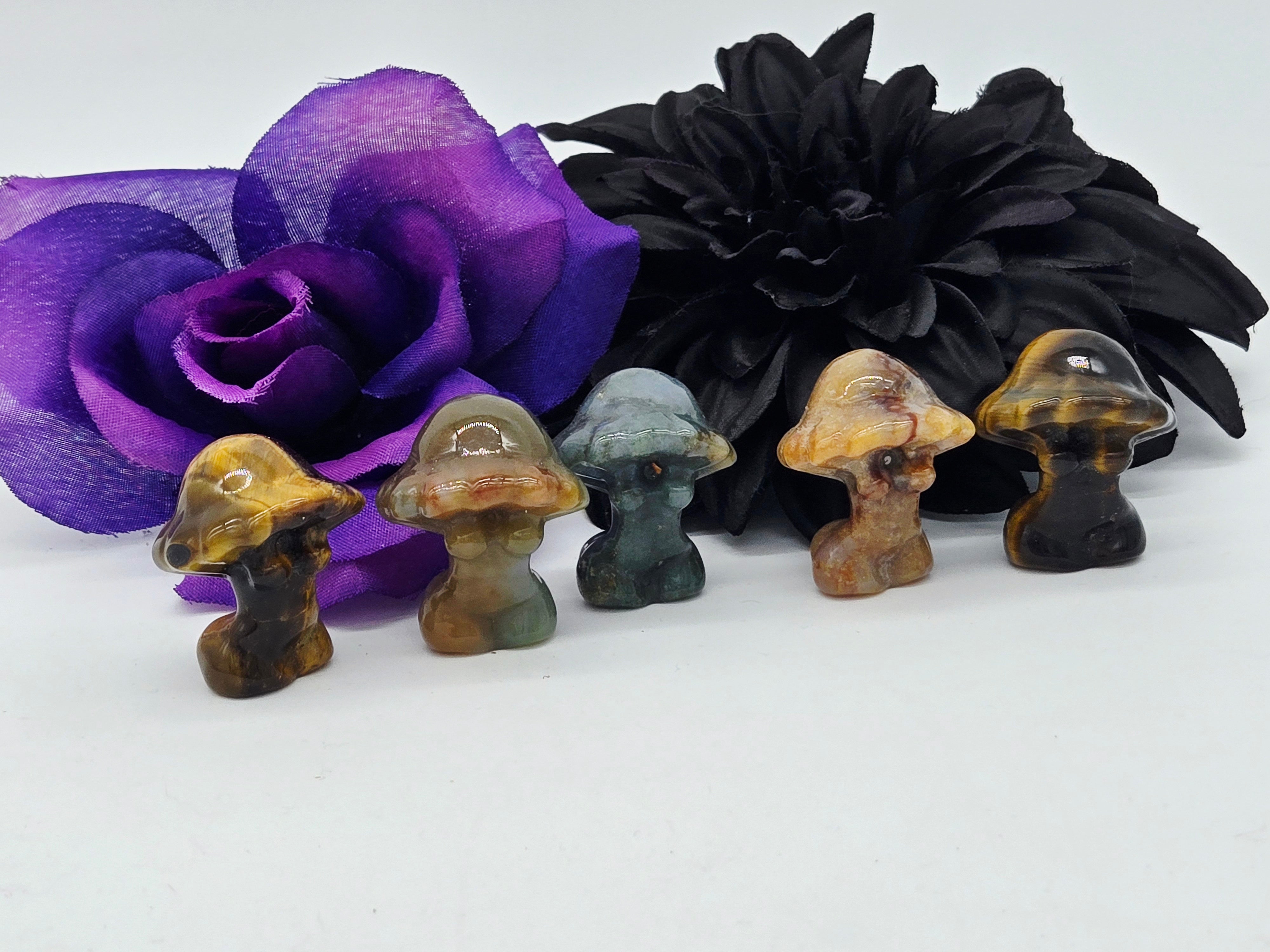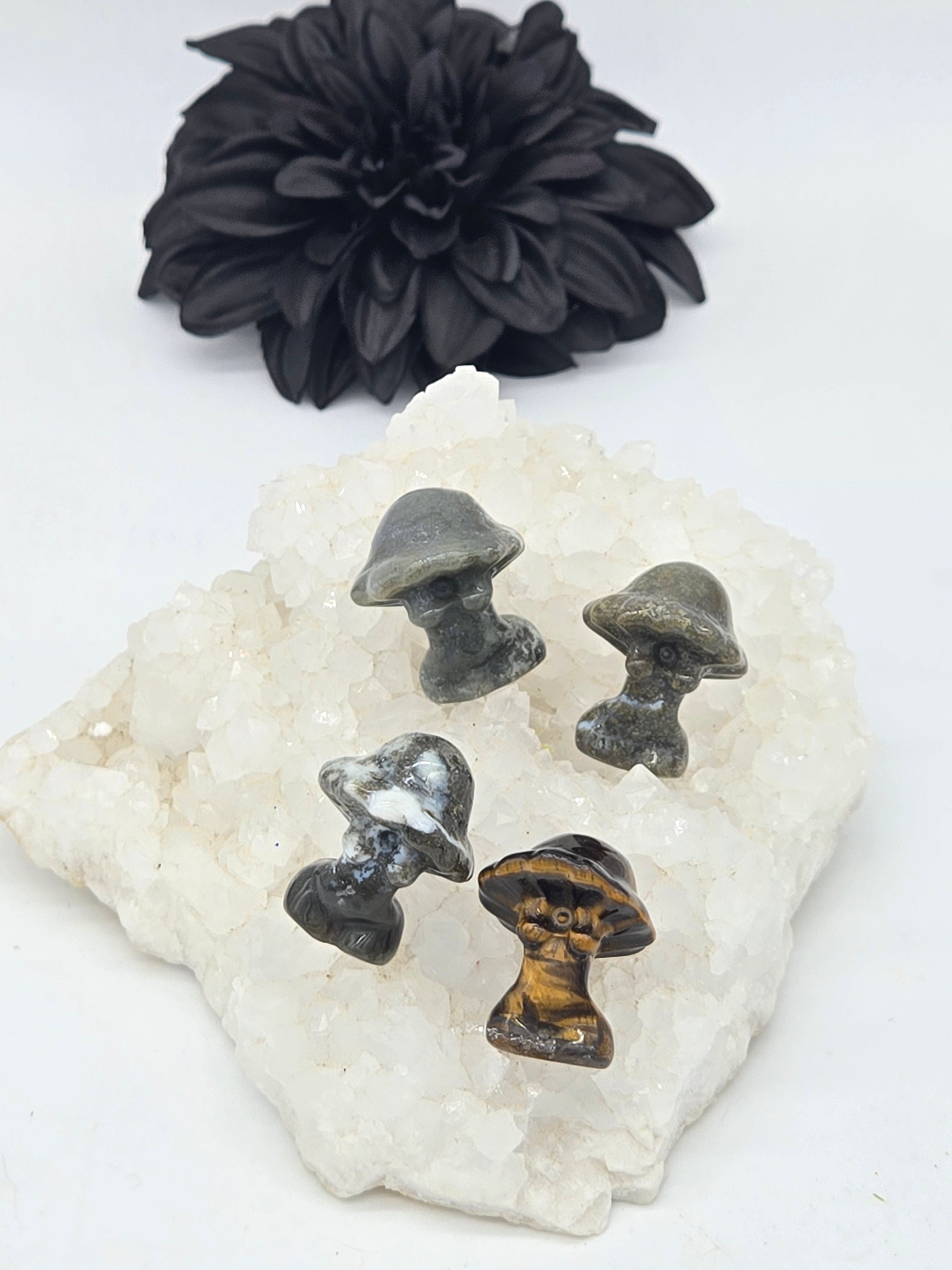 These crystal figurines feature elegant female forms adorned with intricately carved mushroom-shaped heads. Each piece showcases the natural beauty and unique properties of various crystals, from amethyst to rose quartz and beyond. These collectible sculptures blend artisanal craftsmanship with the timeless appeal of crystal collecting. Perfect for display, meditation spaces, or as meaningful gifts for crystal enthusiasts. Every figurine is one-of-a-kind, celebrating both artistic expression and the distinctive characteristics of each stone. Each one is around 2" tall. Price is 1 per order.