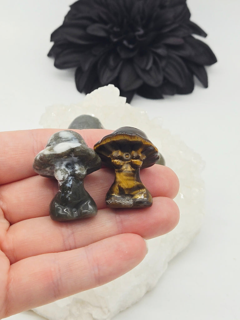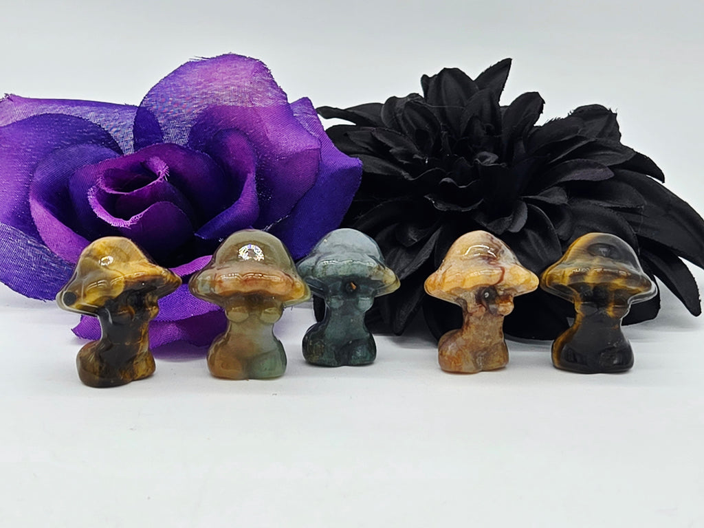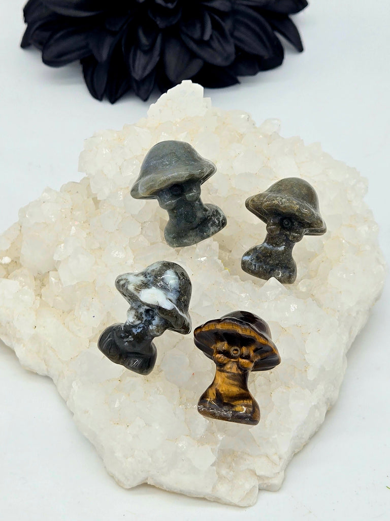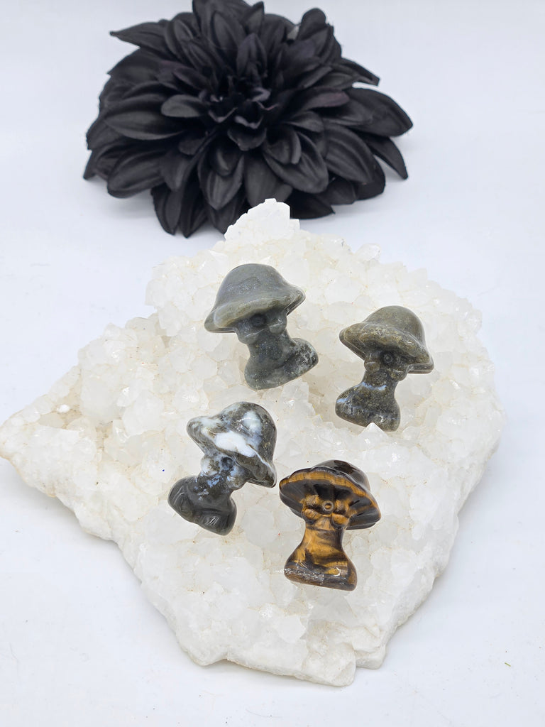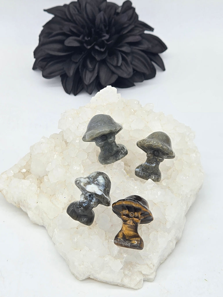 These crystal figurines feature elegant female forms adorned with intricately carved mushroom-shaped heads. Each piece showcases the natural beauty and unique properties of various crystals, from amethyst to rose quartz and beyond. These collectible sculptures blend artisanal craftsmanship with the timeless appeal of crystal collecting. Perfect for display, meditation spaces, or as meaningful gifts for crystal enthusiasts. Every figurine is one-of-a-kind, celebrating both artistic expression and the distinctive characteristics of each stone. Each one is around 2" tall. Price is 1 per order.