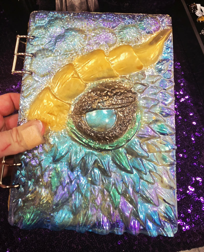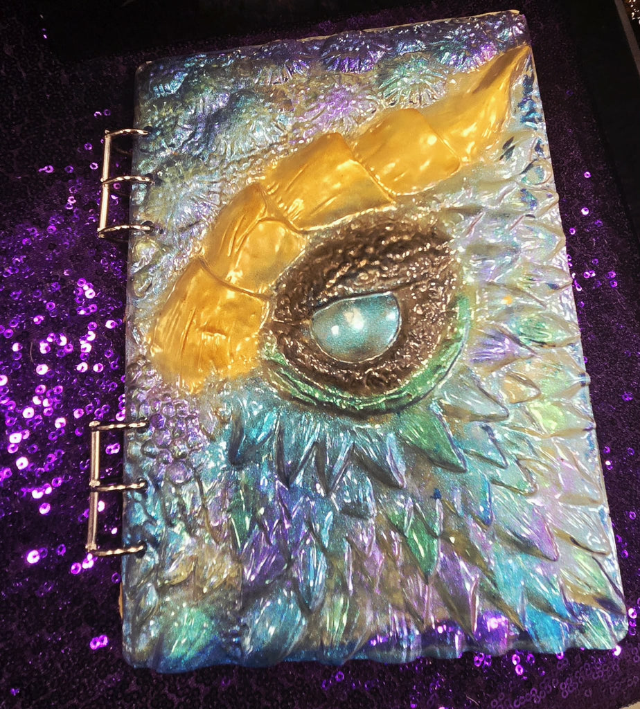This hardback 5" wide by 8" tall handmade dragon eye journal features chameleon colors of great irridecent quality and has 3 metal rings with blank vintage handmade deckled edge paper of recycled cotton paper that is thick and acid-free.