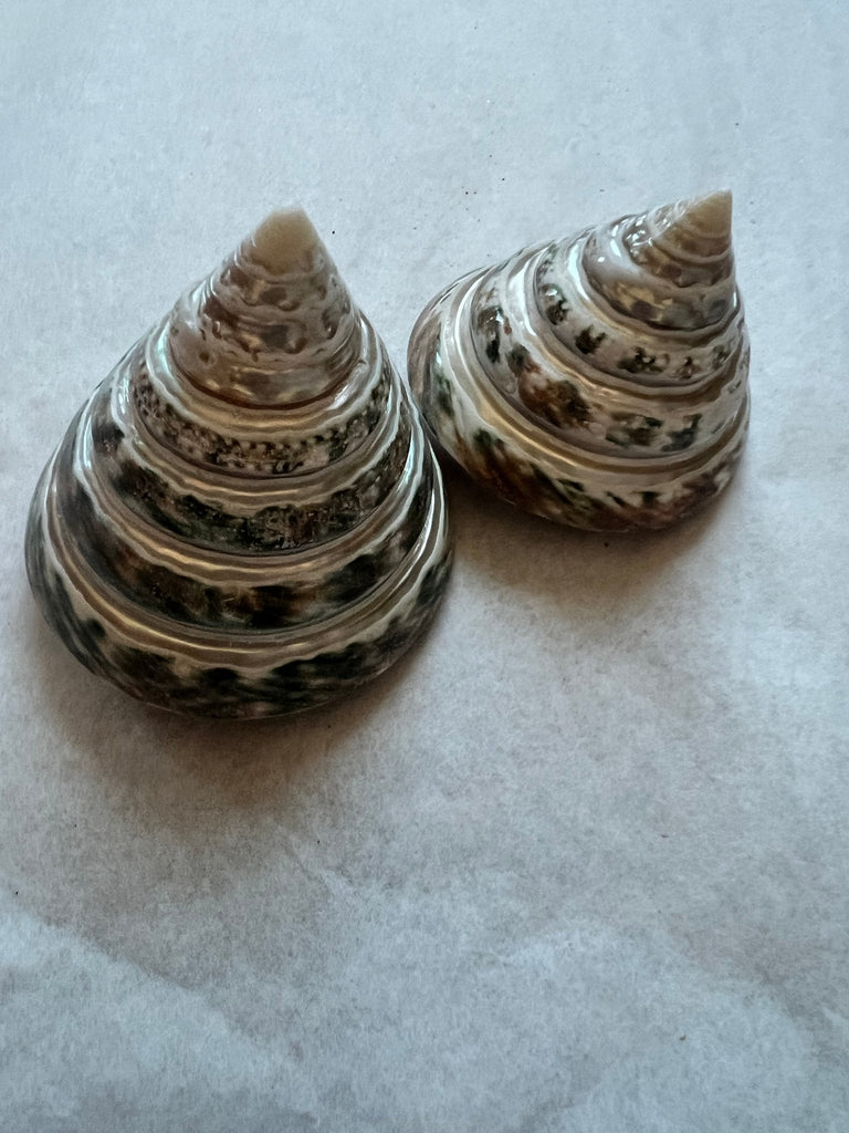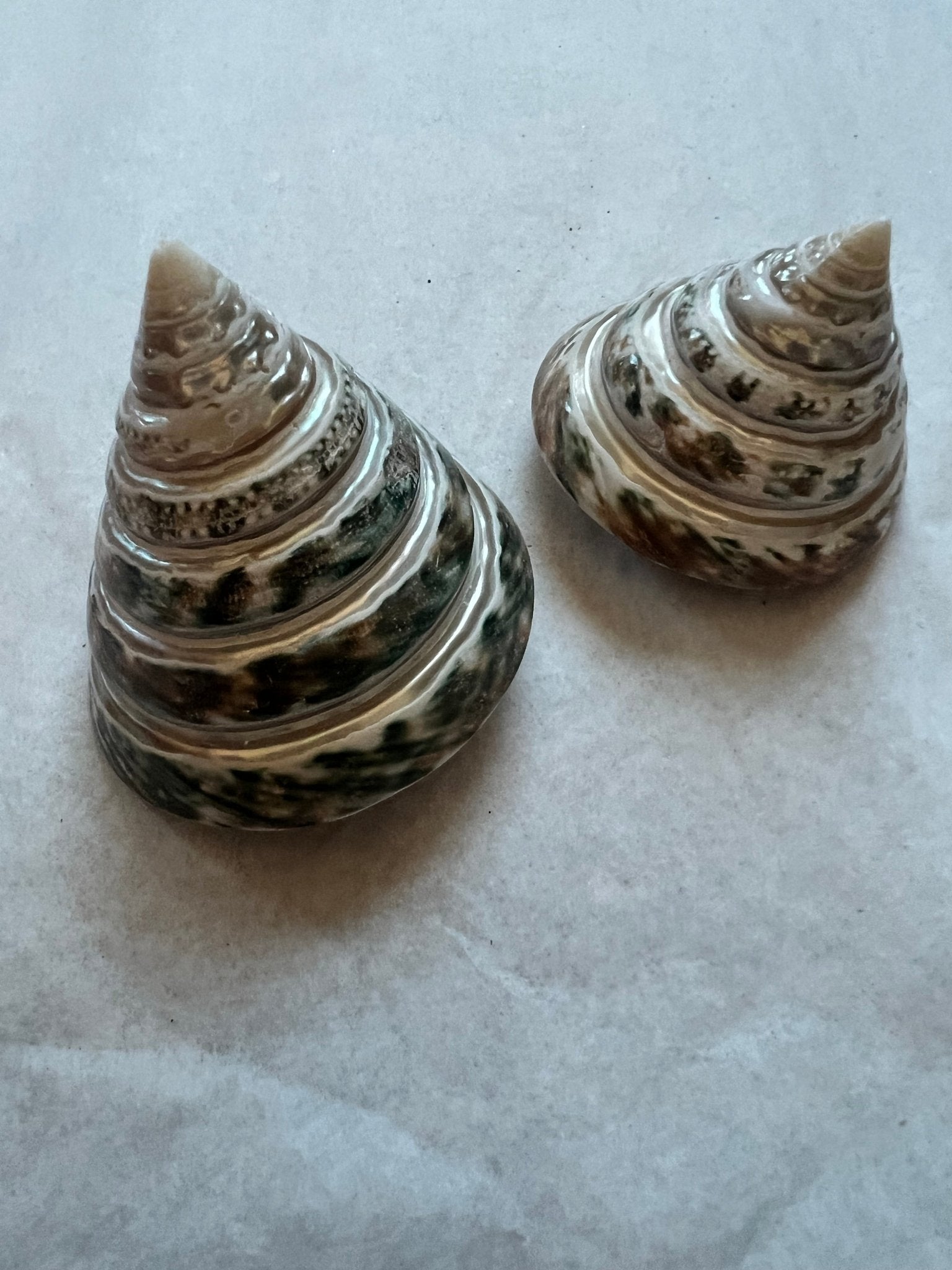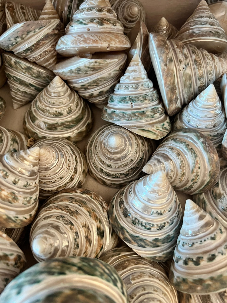 Add a pop of natural texture and subtle shimmer to your coastal display, altar, or home decor with these spiral-cut green Trochus shells. Their beautiful whorled pattern and gentle iridescence make them perfect for bowls, shelves, or tabletop accents. These are great to use on crystal grids, in spell bottles,