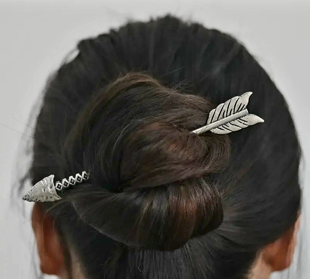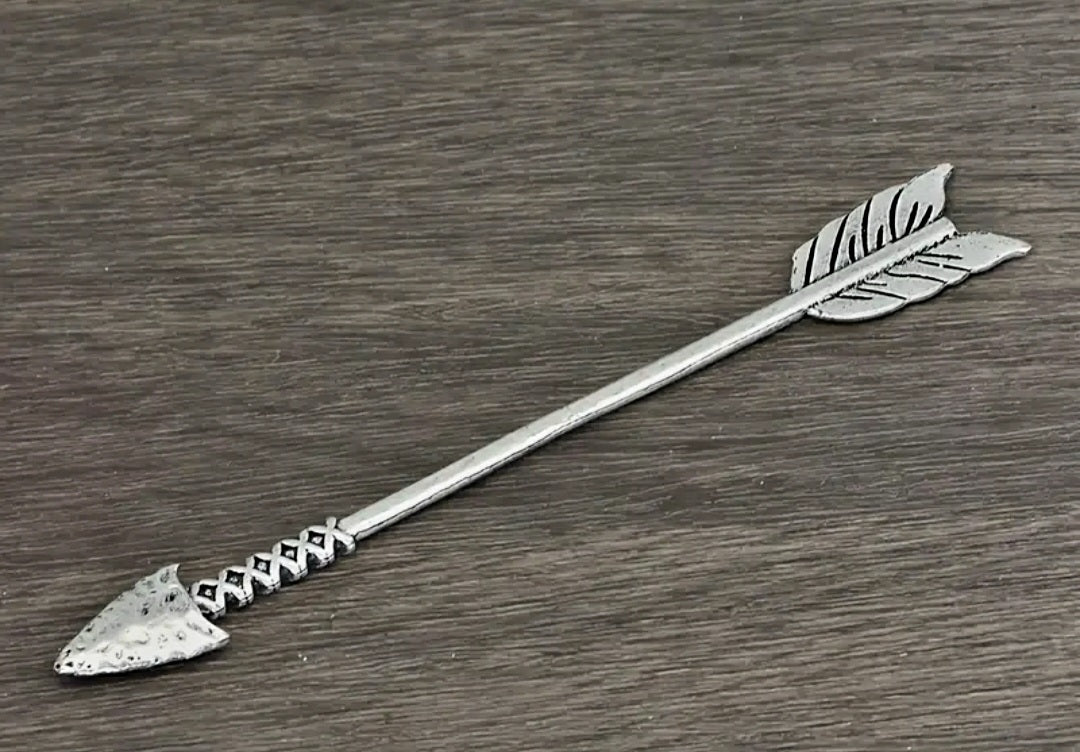 Crafted from polished silver metal, this arrow-shaped hair stick combines functional elegance with artistic flair. The tapered design glides smoothly through thick or textured hair, securing updos with minimal effort while distributing pressure evenly to prevent breakage. Its sleek silhouette makes it a striking accessory that transitions seamlessly from everyday styling to special occasions. Perfect for those seeking both performance and aesthetic appeal in their hair care tools. This silver arrow is around 5-6" long.