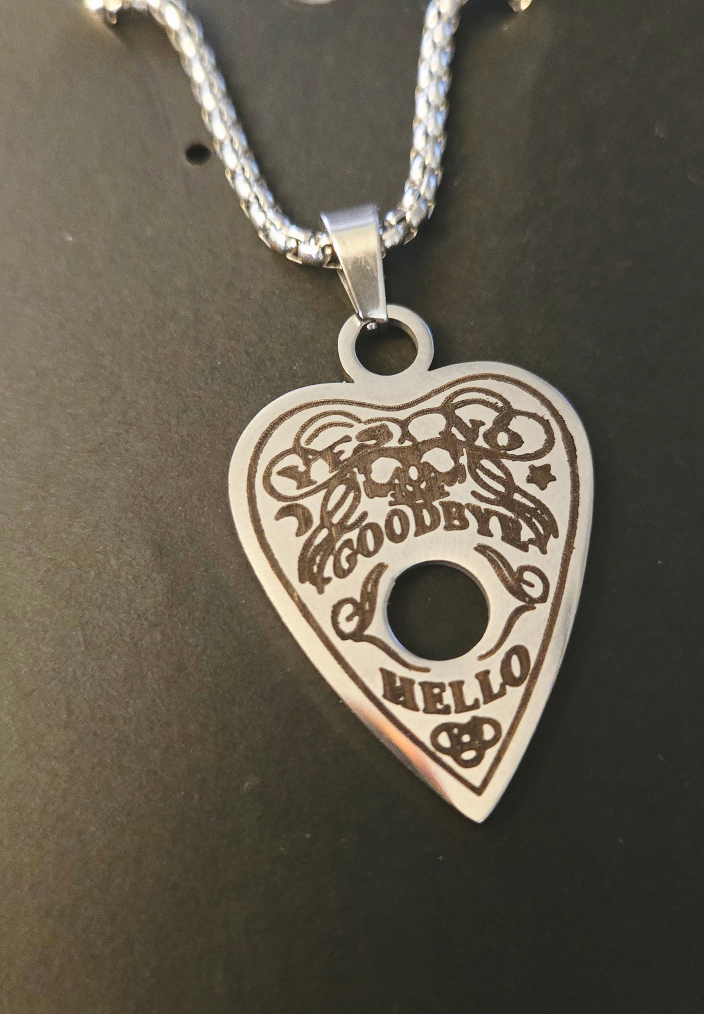 This striking pendant combines gothic aesthetics with occult symbolism, featuring a detailed skull-adorned planchette design rendered in lustrous silver. The necklace captures the mystique of divination tools while serving as a bold statement piece for those drawn to alternative fashion and esoteric traditions. Crafted with attention to detail, the planchette form—historically used in séance practices—becomes wearable art. Perfect for collectors of gothic jewelry, spiritual practitioners, or anyone appreciating darkly elegant accessories. An ideal choice for layering or wearing as a standalone focal point. Each ones hangs upon a silver chain.