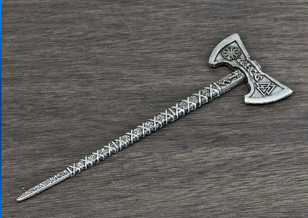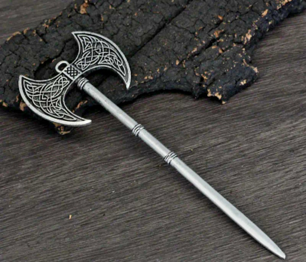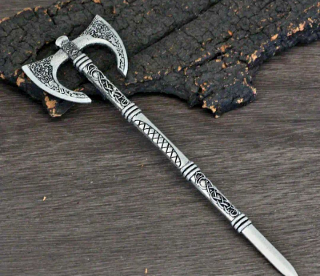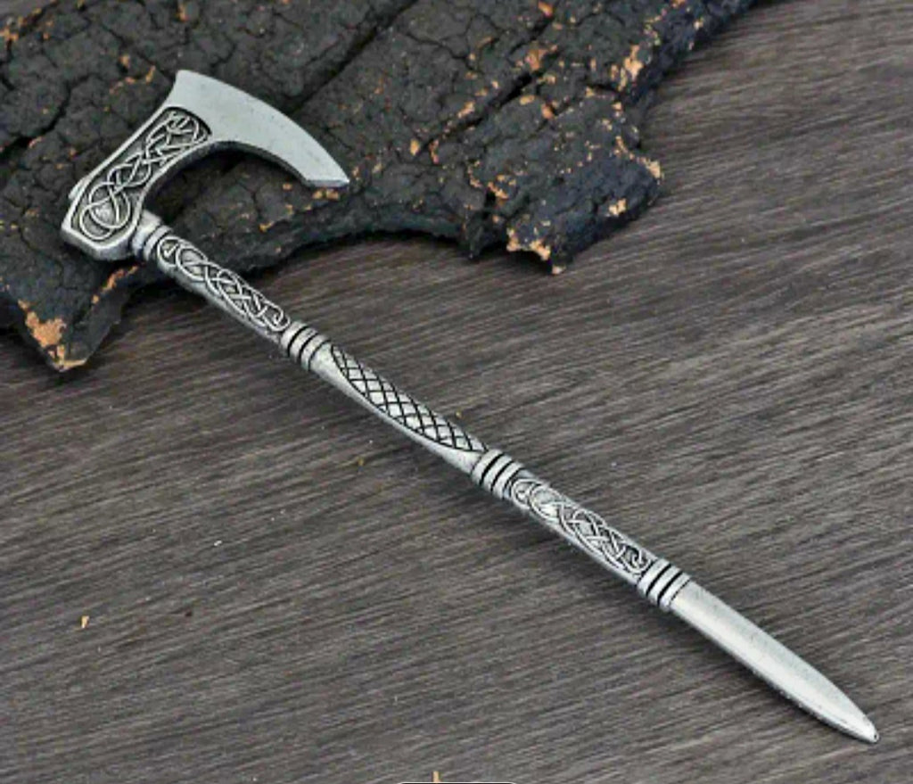 Forge your fiercest look with this striking Viking Battle Axe Hair Pick, expertly crafted from silver metal. Designed for those who command attention, this dual-purpose styling tool combines historical warrior aesthetics with practical hair grooming. The sharp, axe-shaped design glides through tangles and textures with precision, while its substantial metal construction ensures durability through countless styling sessions. Perfect for adding an edge to your personal style while maintaining control over even the most challenging hair types. This silver metal battle axe is around 6" long and features a variety of Viking like details and symbolism. There are different styles available.