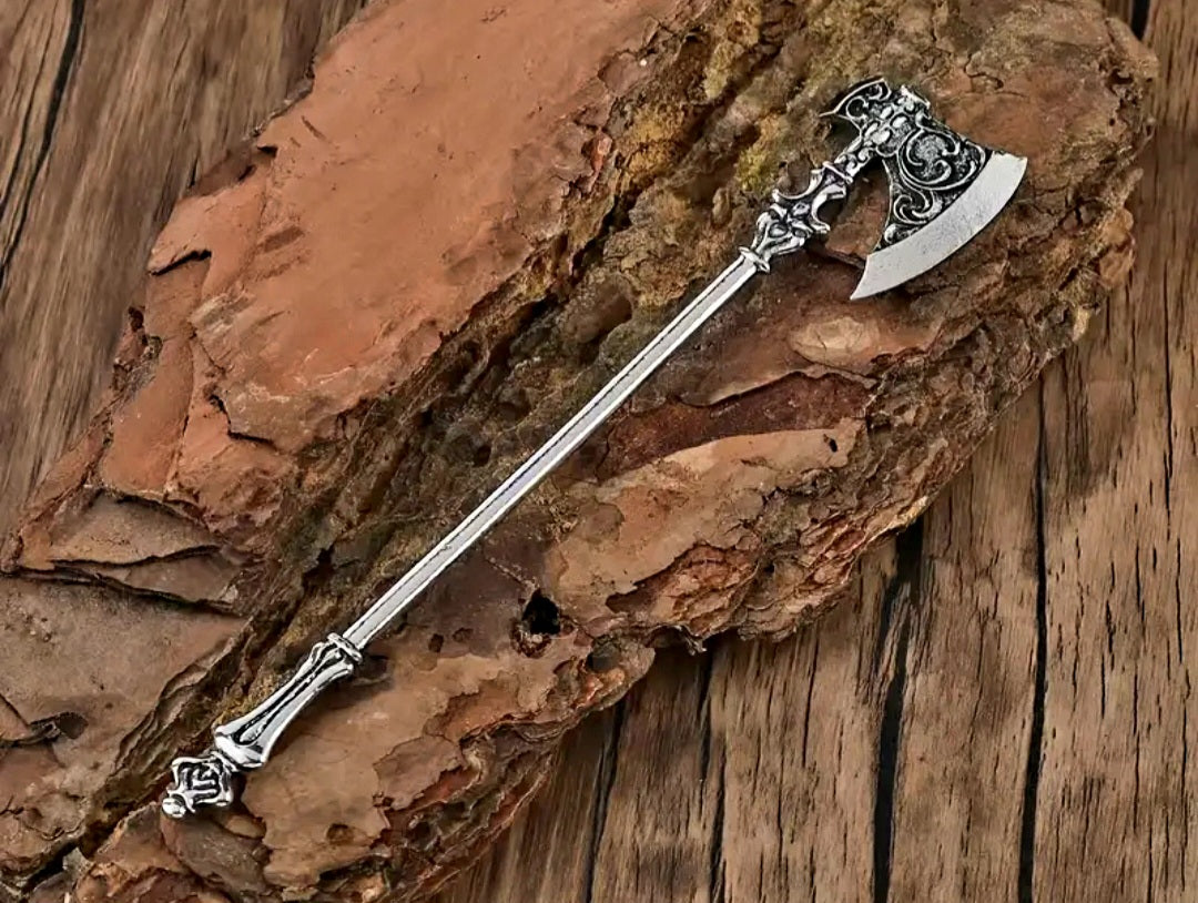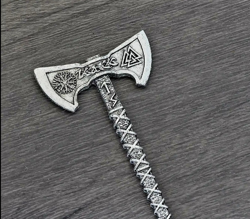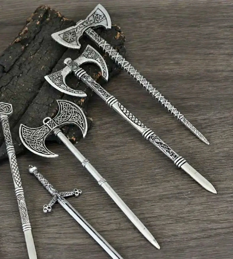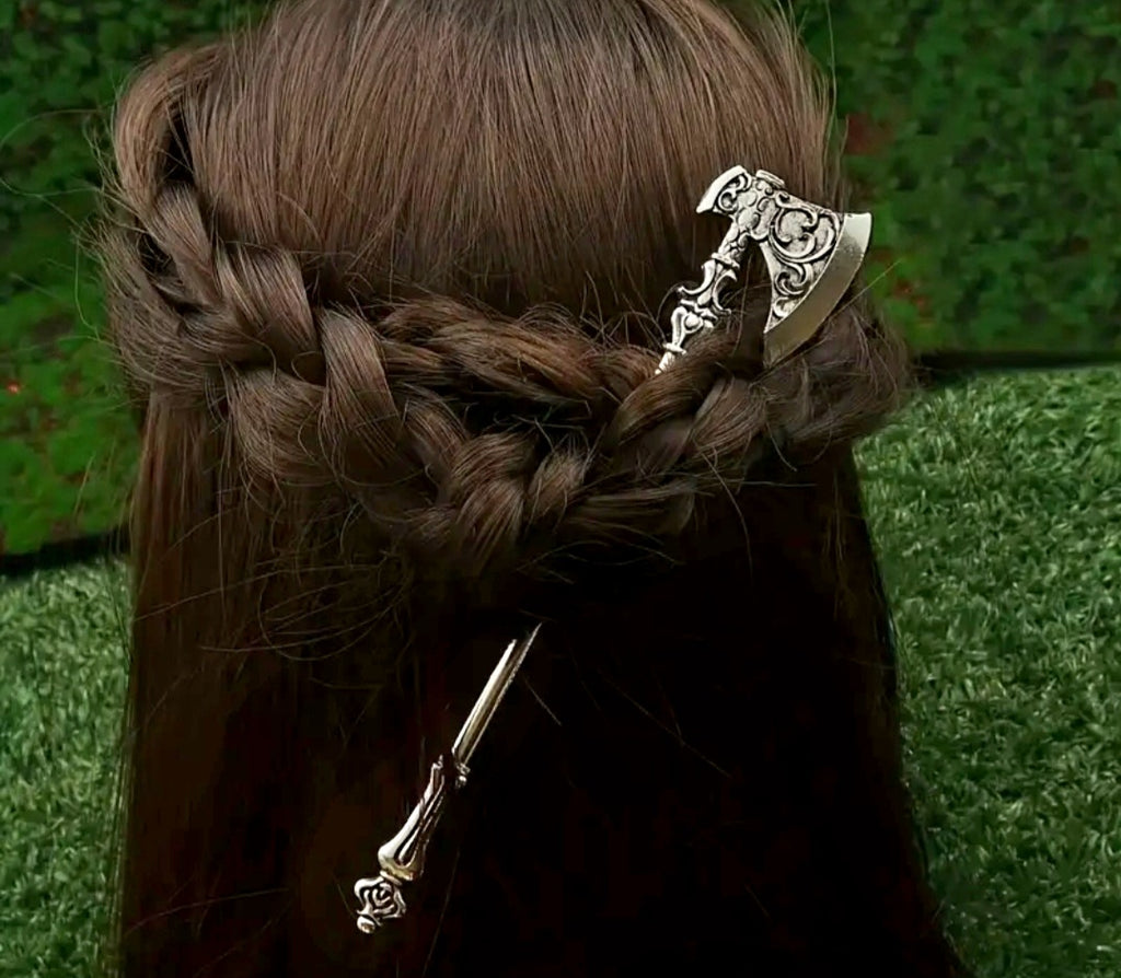 Forge your fiercest look with this striking Viking Battle Axe Hair Pick, expertly crafted from silver metal. Designed for those who command attention, this dual-purpose styling tool combines historical warrior aesthetics with practical hair grooming. The sharp, axe-shaped design glides through tangles and textures with precision, while its substantial metal construction ensures durability through countless styling sessions. Perfect for adding an edge to your personal style while maintaining control over even the most challenging hair types. This silver metal battle axe is around 6" long and features a variety of Viking like details and symbolism. There are different styles available.