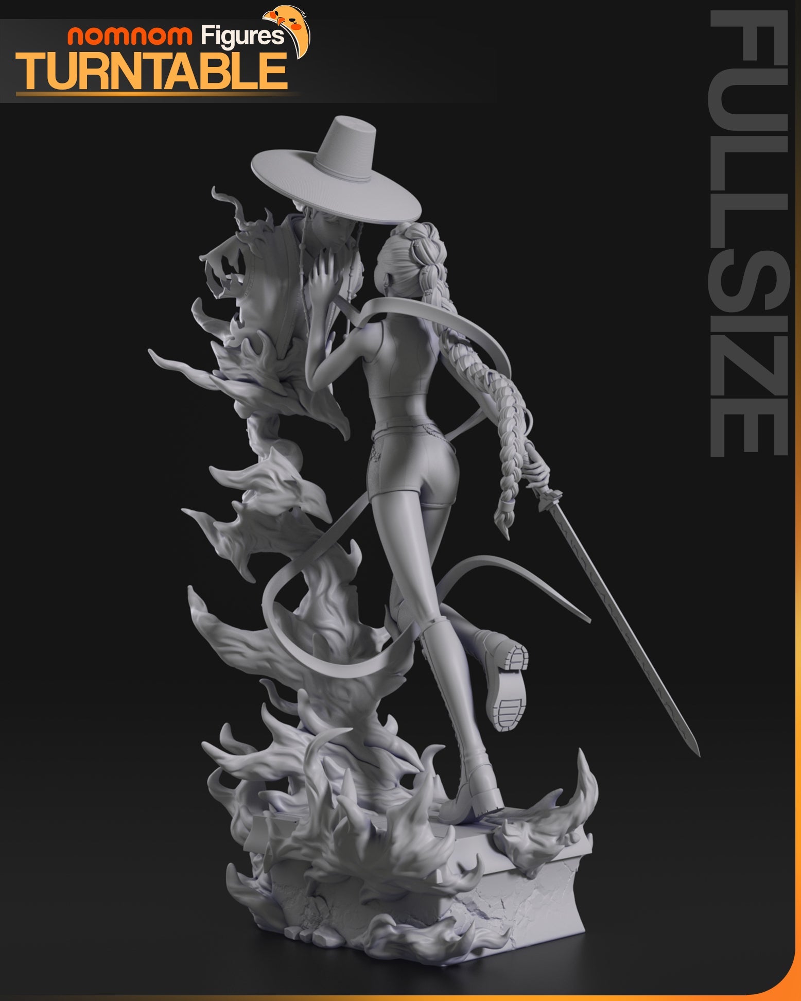 Rumi from K-Pop Demon Hunters struts in ready to slay demons and steal your shelf space. Available in 1:10 scale, 75mm, and bust, this figure shows her mid-battle pose against a shadowy foe with swirling flame effects. Perfect for fans who like their idols armed with swords instead of microphones.