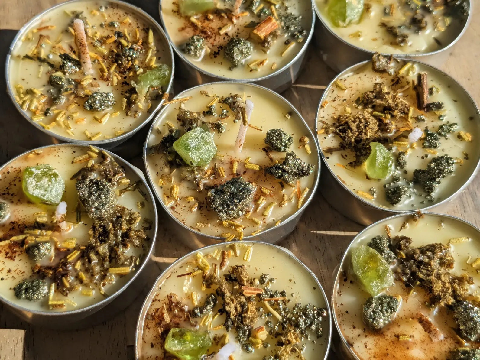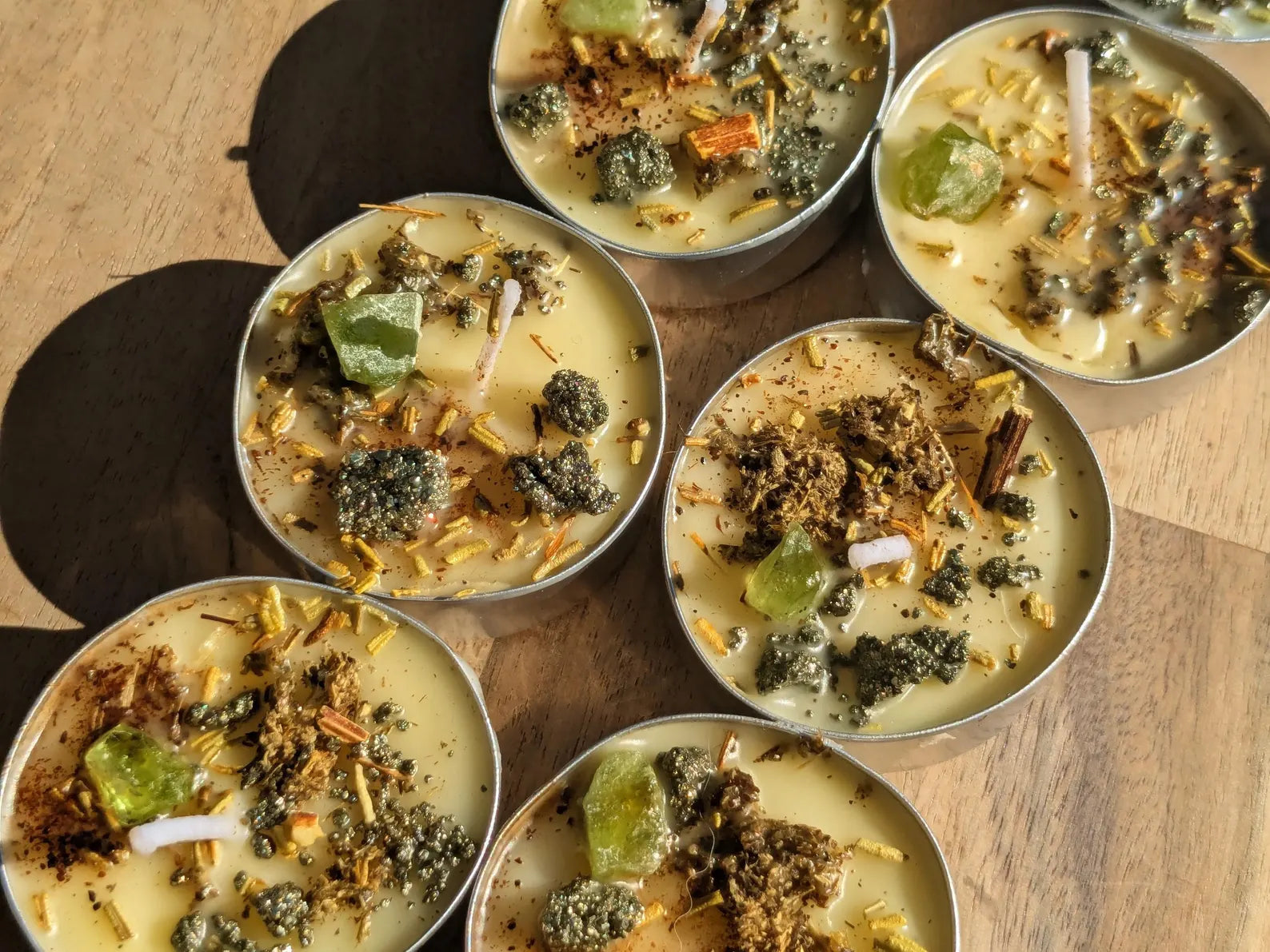 Each candle is dressed with mugwort, rosemary, clove, pyrite, and peridot.
